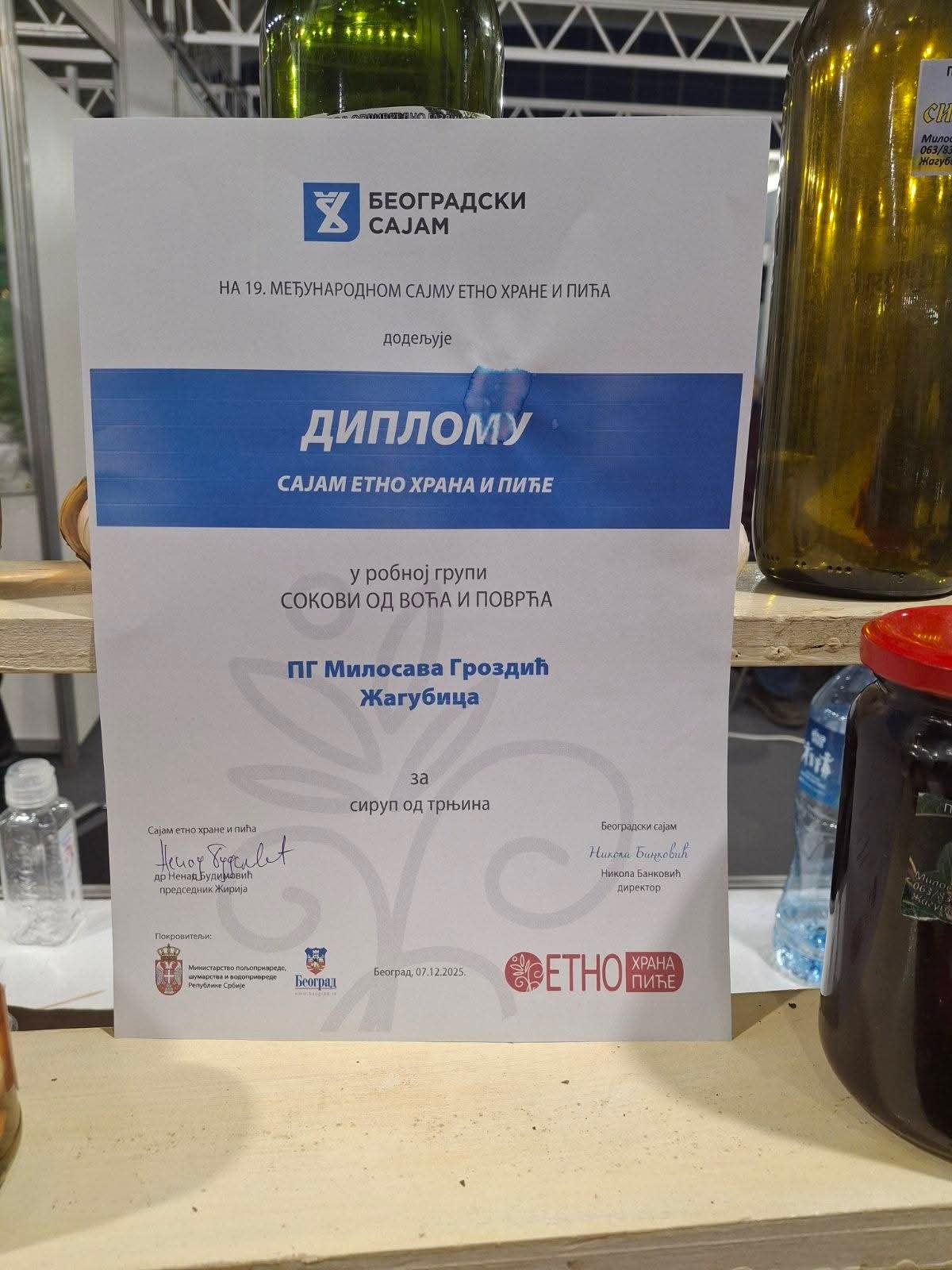 Ове године из општине Жагубица ДИПЛОМУ за изузетан квалитет и допринос очувању аутентичног укуса добила је Милосава Гроздић из Жагубице, за производ сируп од трњина у робној групи СОКОВИ ОД ВОЋА И ПОВРЋА.